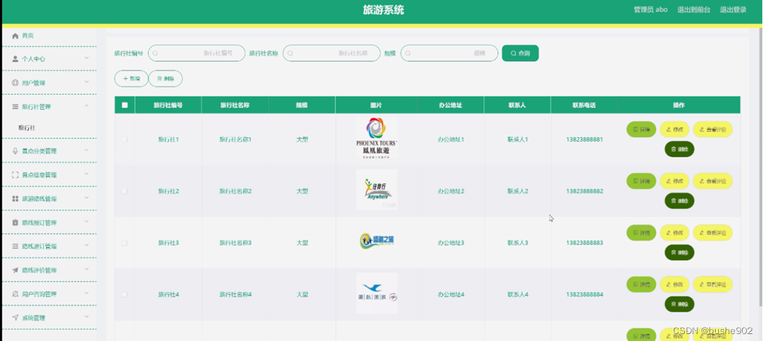 旅行社管理:在旅行社管理页面中可以查看旅行社编号、旅行社名称、规模、图片、 办公地址、联系人、联系电话等内容,进行详情、修改、查看评论或删除等操作,如图5-9所示。