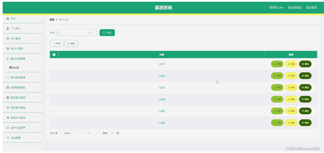 景点分类管理;在景点分类管理页面中可以查看分类进行详情、修改或删除等操作;,如图5-10所示。