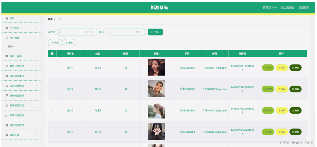 用户管理:用户名、姓名、 性别、头像、手机、邮箱、身份证等内容,进行详情、修改或删除等操作,如图5-8所示。