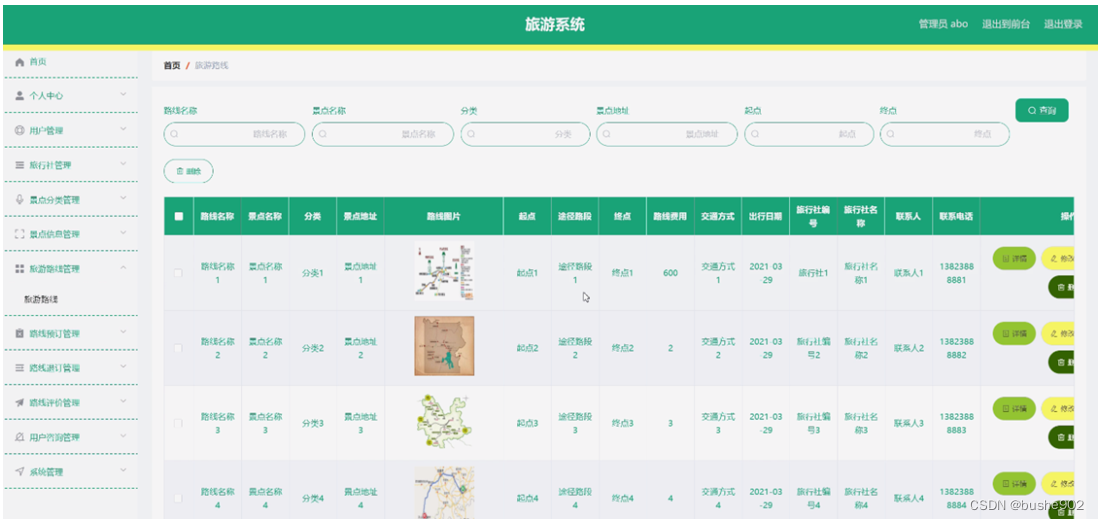 旅行路线管理:在旅行路线管理页面中可以查看路线名称、景点名称、分类、景点地址、路线图片、起点、途径路段、终点、路线费用、交通方式、出行日期、旅行社编号、旅行社名称、联系人、联系电话等内容,进行详情、修改、查看评论或删除等操作;,如图5-12所示。
