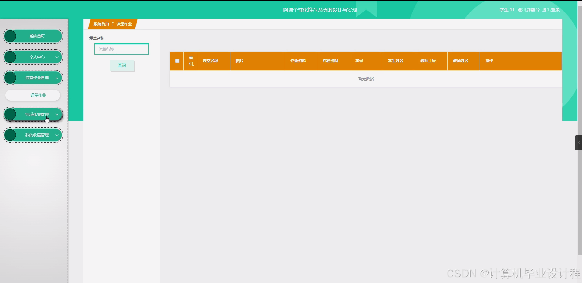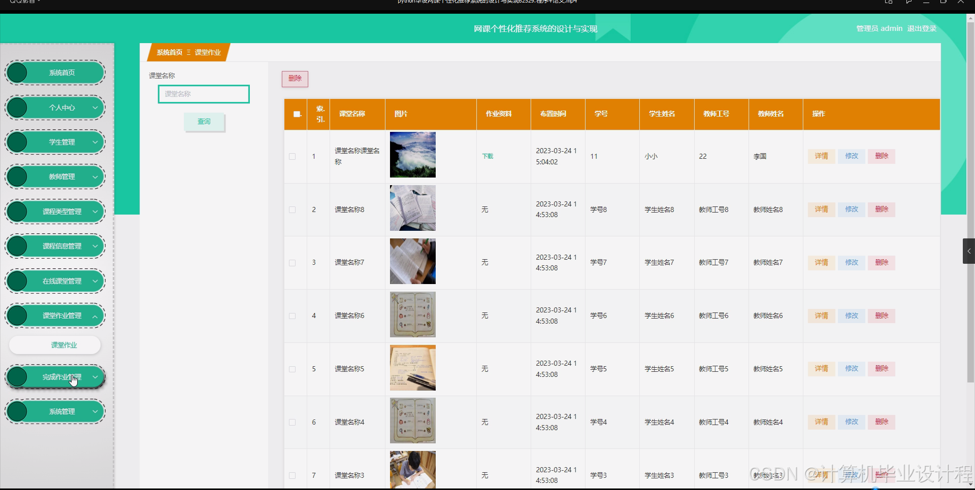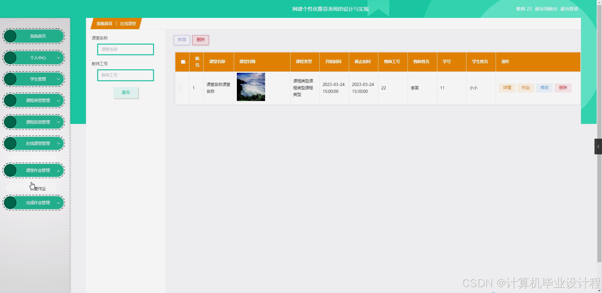 本研究将围绕网课个性化推荐系统的核心功能展开,具体包括学生信息管理模块、教师信息管理模块、课程类型管理模块、课程信息管理模块、在线课堂管理模块、课堂作业管理模块以及个性化推荐算法模块等。学生信息管理模块将实现学生基本信息的录入、修改和查询等功能,为个性化推荐提供基础数据。教师信息管理模块将实现教师基本信息的录入、修改和查询等功能,方便教师管理自己的课程。课程类型管理模块将实现课程类型的划分和管理,为课程信息的分类和检索提供支持。课程信息管理模块将实现课程信息的录入、修改、查询和展示等功能,方便学生和教师浏览和搜索课程资源。在线课堂管理模块将实现在线课堂的创建、管理和监控等功能,确保在线课堂的顺利进行。课堂作业管理模块将实现课堂作业的布置、提交和批改等功能,帮助学生巩固所学知识。个性化推荐算法模块将基于学生的学习行为和偏好,运用智能算法进行课程推荐,为学生提供个性化的学习路径。