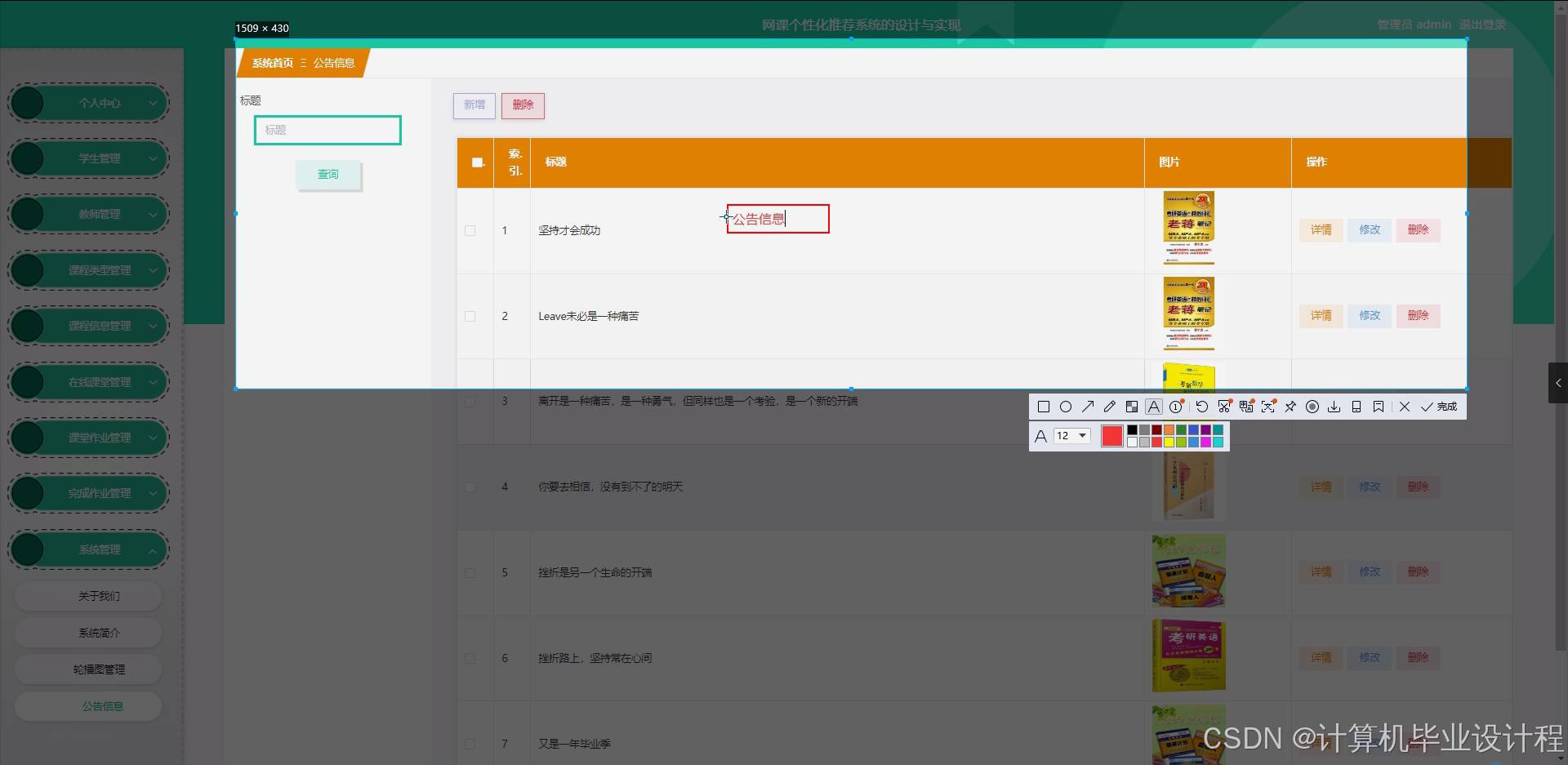 随着互联网技术的飞速发展,在线教育已成为教育领域的重要组成部分。网课以其灵活便捷的特点,吸引了大量学生和教师的参与。然而,面对海量的课程资源,学生往往难以找到最适合自己的课程,导致学习效果不佳。同时,教师也面临着如何精准推送课程,以满足不同学生的学习需求的问题。因此,开发一套网课个性化推荐系统,通过智能算法分析学生的学习行为和偏好,为教师提供精准的课程推送策略,为学生推荐符合其兴趣和需求的课程,已成为当前在线教育领域亟待解决的重要课题。