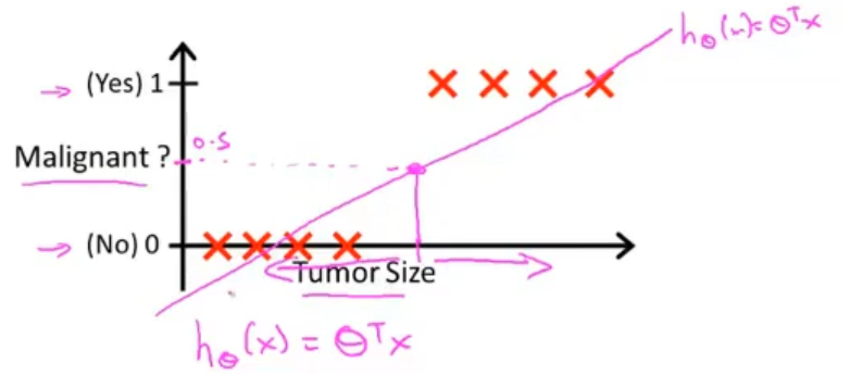对于的输出,我们将它看做是对于输入变量x,输出y的概率估计。比如,我们用上面肿瘤分类的例子,我们有一个特征向量x,与当初训练线性模型一样,让