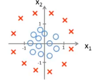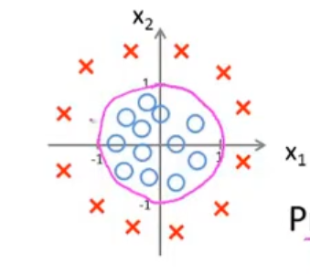 在圆上的点就是的点,也就是h(x)正好等于0.5的区域,在圆圈外面的点,我们预测为1,在圆圈里面的点,我们预测为0.