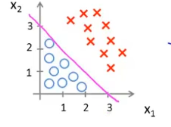 的部分,也就是预测为y=0的部分。其中,这条粉红色的直线就是决策边界。这条线上的点就是h(x)正好等于0.5的区域。