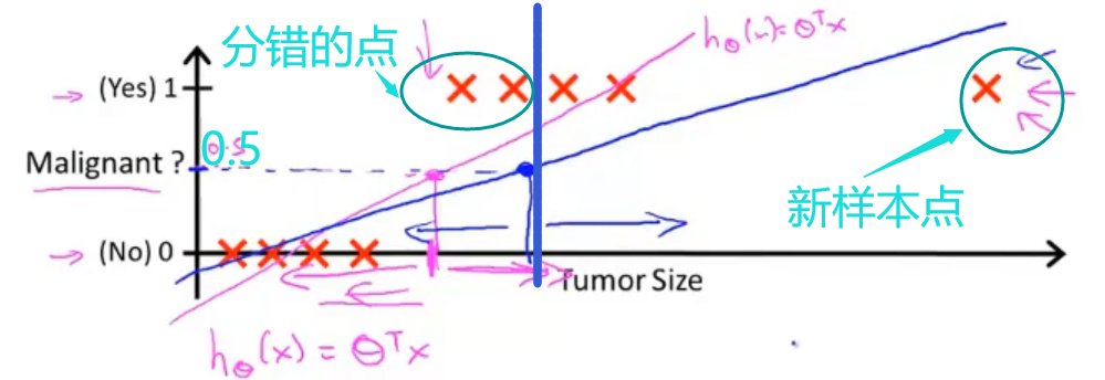 线性回归看似能很好的解决分类问题,但是会存在很多问题,我们将x轴延长,在较远的地方得到一个新的样本,重新训练线性回归模型(图中的蓝色线),将阈值还是设置为0.5,会发现以下情况:由于新样本的加入,有的样本被错分了。