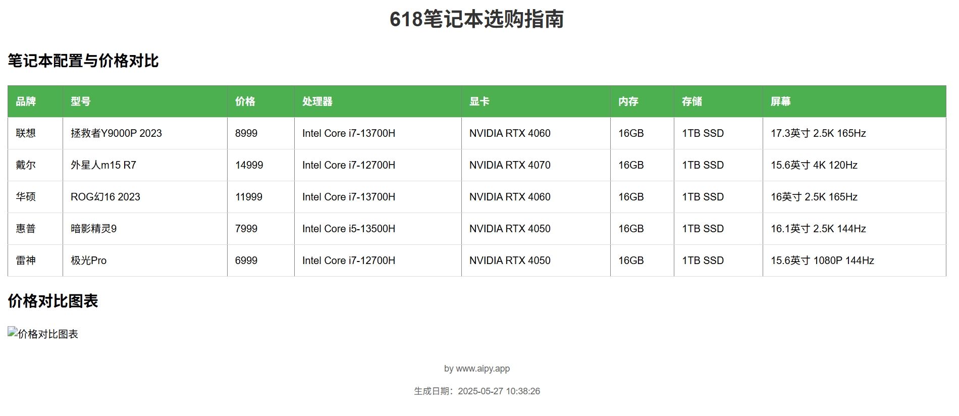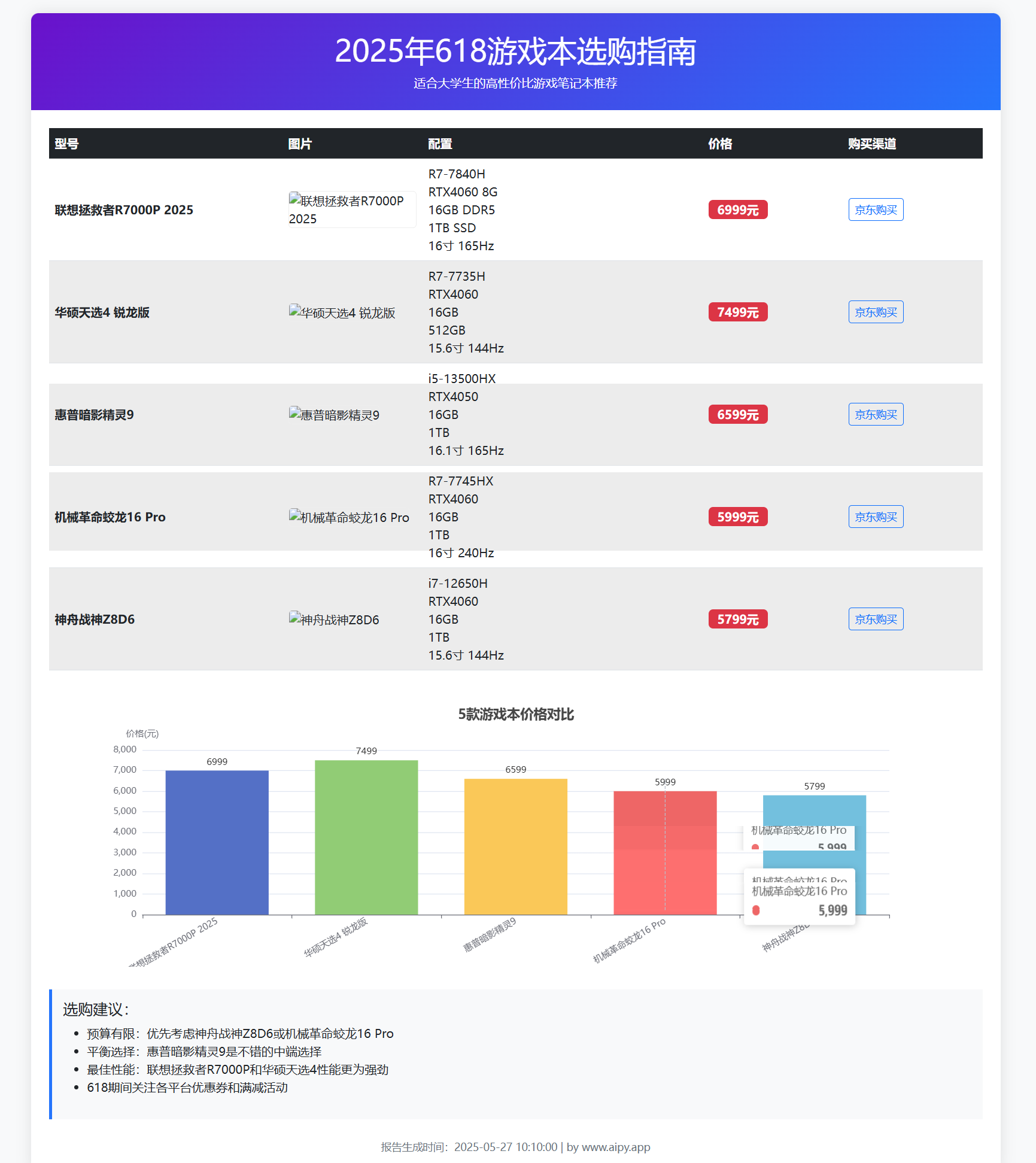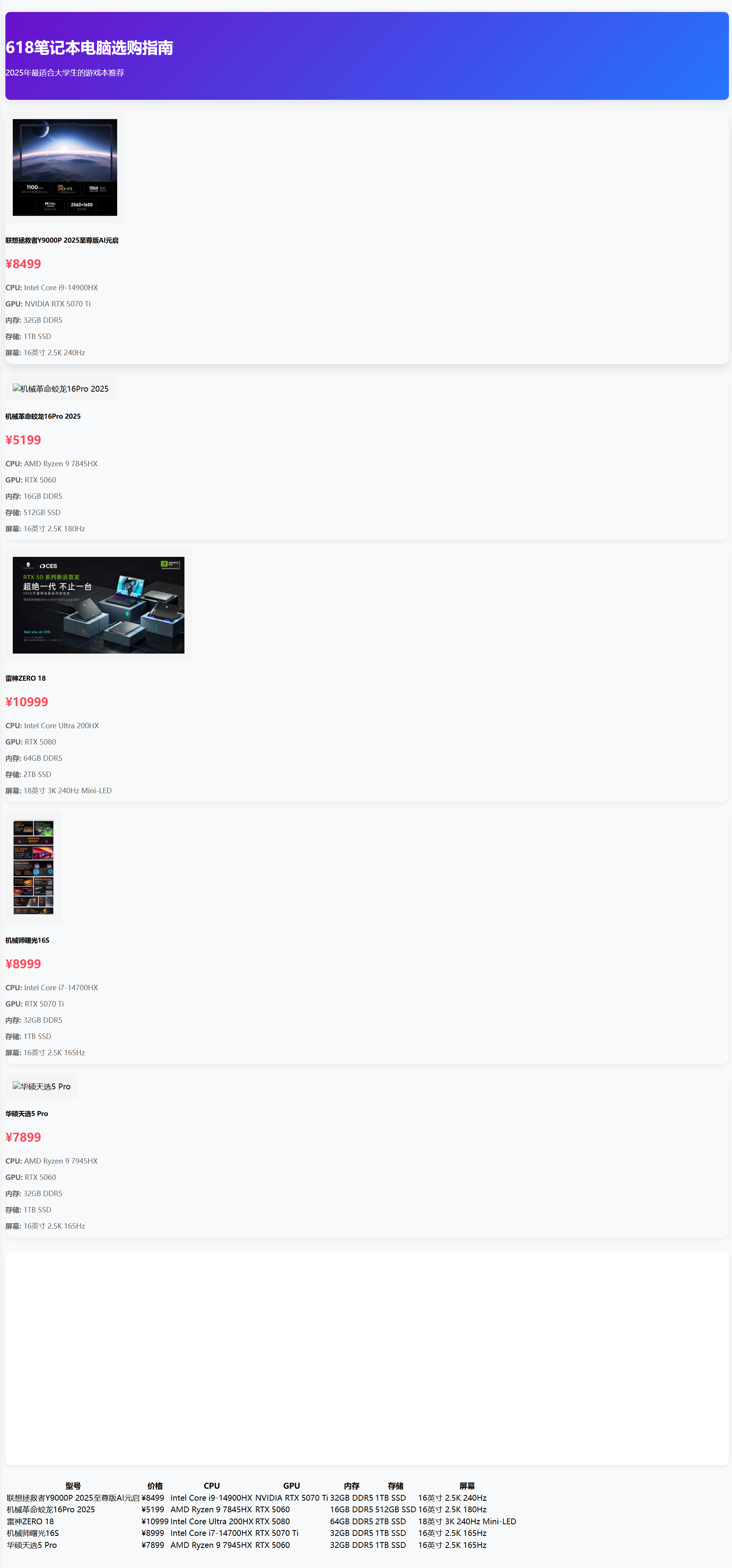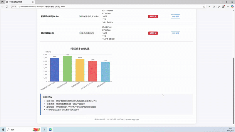 提示词:我是今年大一的学生,准备在618活动买一台笔记本电脑,平时有打游戏、看视频的需求,请帮我检索各类网站,选取5款适合我的笔记本电脑,并将他们的价格、图片、配置与价格做成表格,生成一份精美的HTML文档,名字为“618笔记本选购”并保存在桌面上