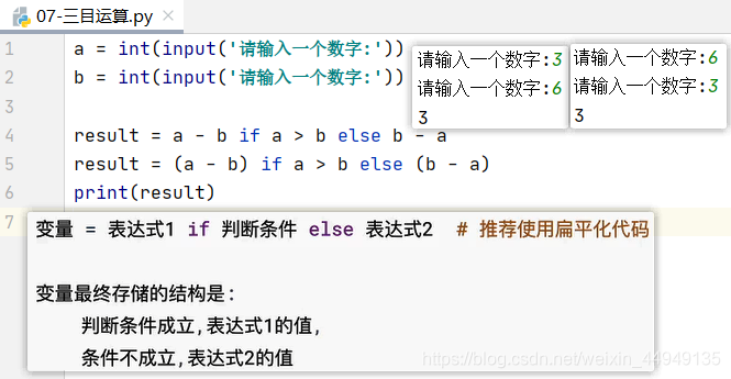 变量 = 表达式1 if 判断条件 else 表达式2 # 推荐使用扁平化代码
