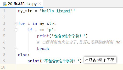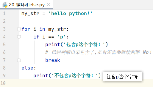 需求:有一个字符串 'hello python',想要判断这个字符串中有没有包含“p”这个字符。如果包含,就输出“包含p这个字符!”;如果没有 p ,就输出“不包含p这个字符!”。