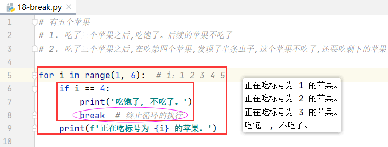 3. break 是终止循环的执行, 即循环代码遇到 break,就不再循环了。