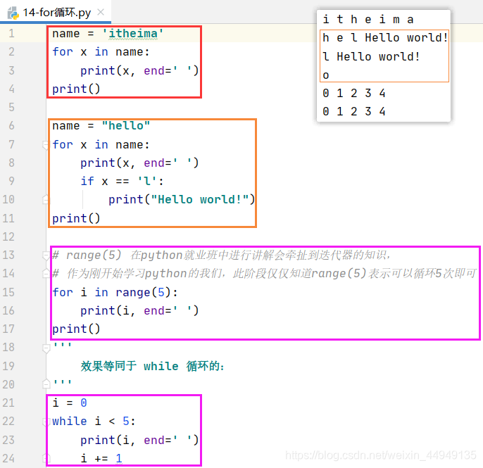 for循环 也称为 for遍历,会将字符串中的字符全部取到。