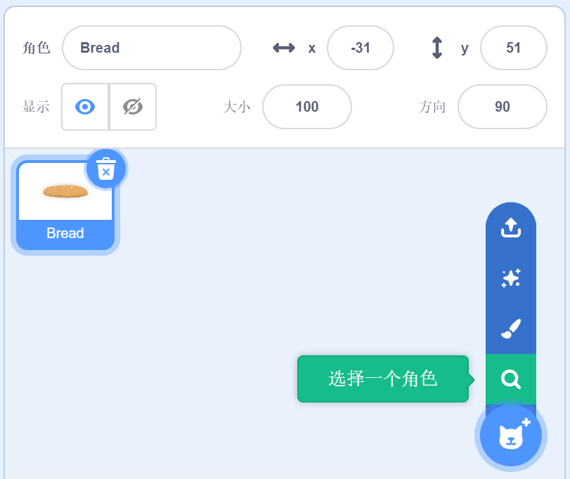 在角色区,点击“选择一个角色”菜单,从角色库中选择角色“Bread”作为垃圾。