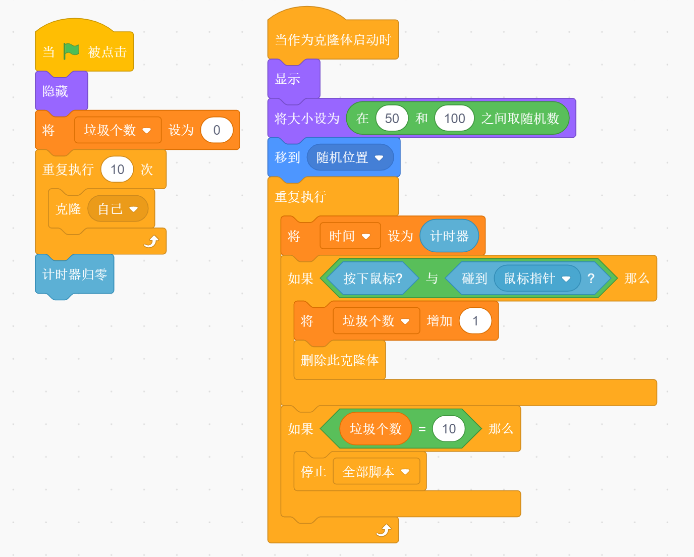(1)点击绿旗,角色克隆10次作为10个垃圾,大小不一,位置随机;