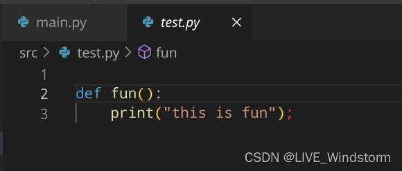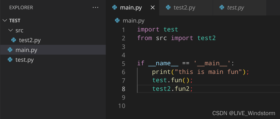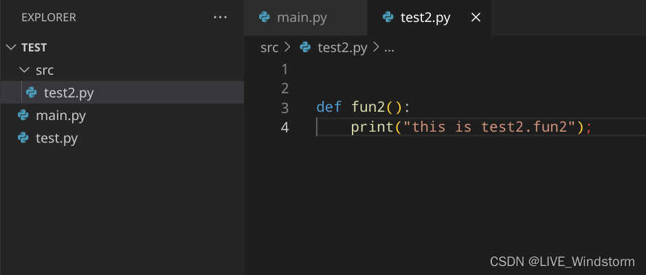 4.如果不在同一个目录下,就需要使用from....import...了。比如新建一个test2.py在src文件下。