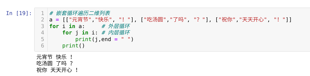 a = [["元宵节","快乐", "!"], ["吃汤圆","了吗", "?"], ["祝你","天天开心", "!"]]