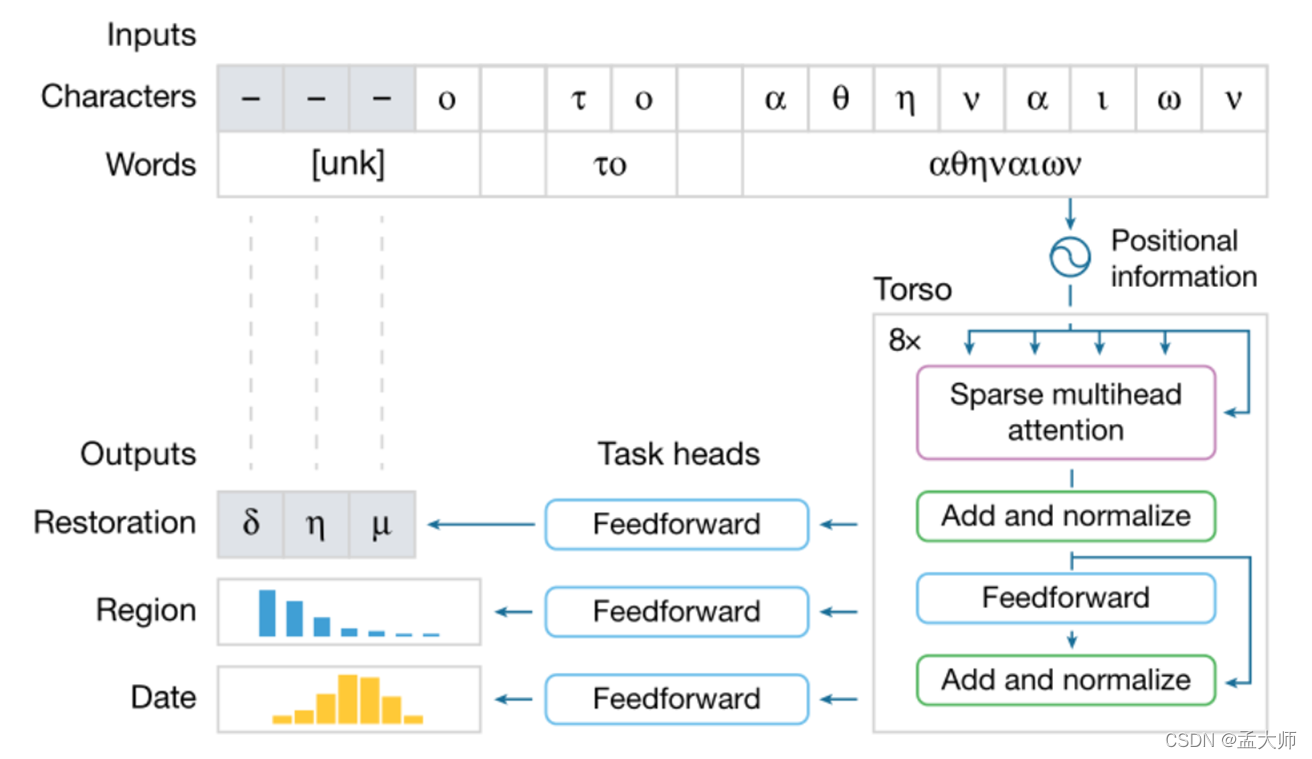 Ithaca的主体结构是若干个堆叠的Transformer块用作信息解码,连接三个前馈小网络(任务头),分别用于预测缺失文本,预测地理归属,预测书写年限