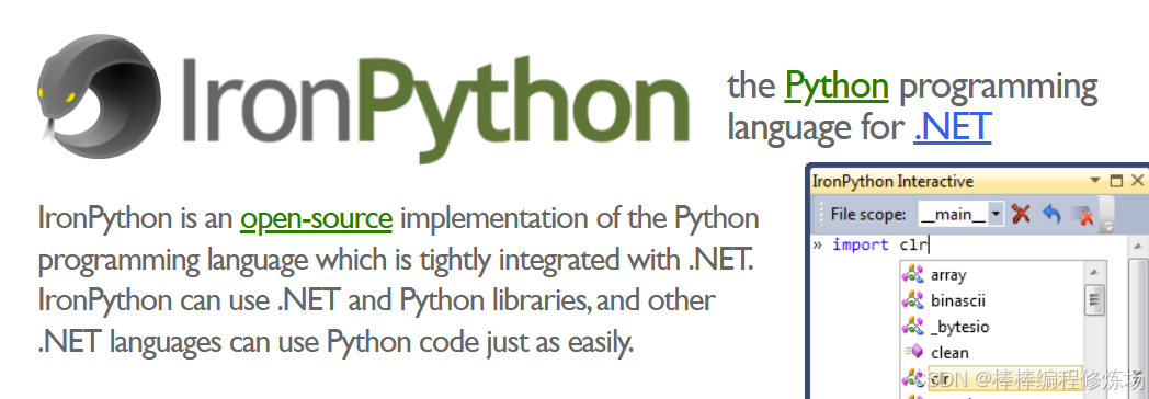 ③ IronPython: IronPython 是运行在 .Net 平台上的一款 Python 解释器,可以直接将 Python 代码转换为 .Net 的字节码。IronPython 是将 Python 引入到 .NET 框架中,这个项目受到了微软的大力支持,因为 IronPython 的主要开发人员都在微软工作。