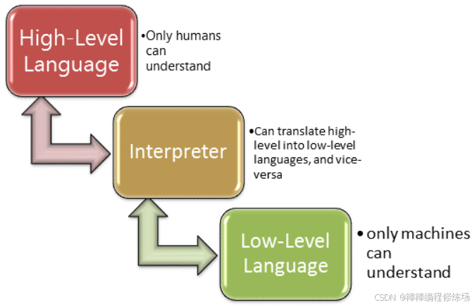 语言越高级,越接近人类的自然语言和数学语言。语言越低级,越能让机器理解。高级语言和低级语言之间需要一个转换的工具:编译器、解释器,关于编译型语言和解释型语言的含义和区别,后续小节会进行详细介绍。