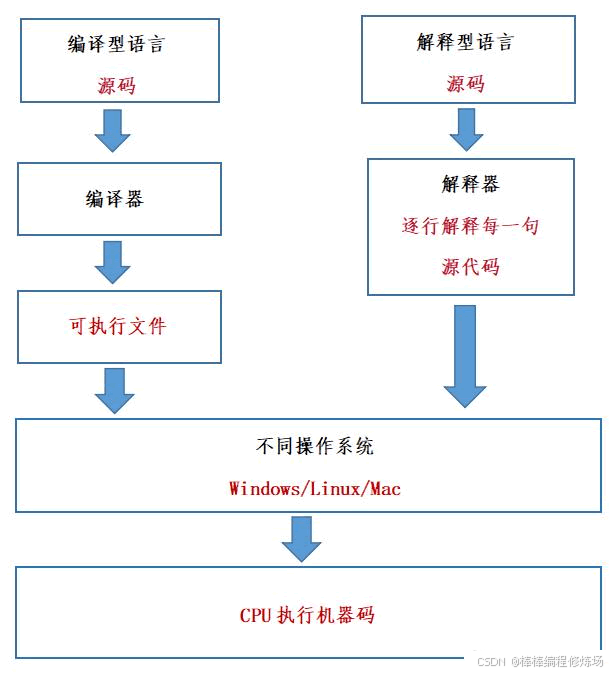 是真实存在的,而且比比皆是。那么,为什么解释型语言就能跨平台呢?其实,这一切都要归功于解释器!这里所说的跨平台,是指源代码跨平台,而非解释器跨平台。解释器用来将源代码转换成机器码,它本质上就是一个可执行程序,是绝对不能跨平台的。我们以 Python 为例,Python 官方针对不同平台(比如 Windows、macOS、Linux)开发了不同的解释器,这些解释器必须要遵守同样的语法,识别同样的函数,完成同样的功能。只有这样,同一份代码才能在不同平台上拥有相同的执行结果。你看,解释型语言之所以能够跨平台,是因为有了解释器这个中间层。在不同的平台下,解释器会将相同的源代码转换成不同的机器码,解释器帮助我们屏蔽了不同平台之间的差异性。Python 属于典型的解释型语言,所以运行 Python 程序需要解释器的支持,只要你在不同的平台安装了不同的解释器,你的代码就可以随时随地运行,不用担心任何兼容性问题,真正实现了 "一次编写,到处运行"