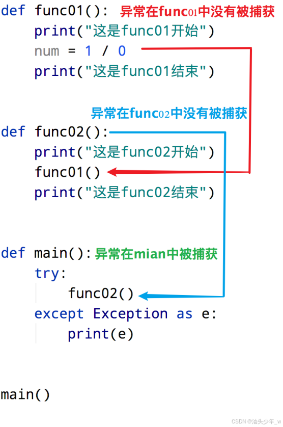 当一段代码可能会发生异常时,我们需要进行异常的捕获,当代码之间有嵌套时,异常会从里向外传递