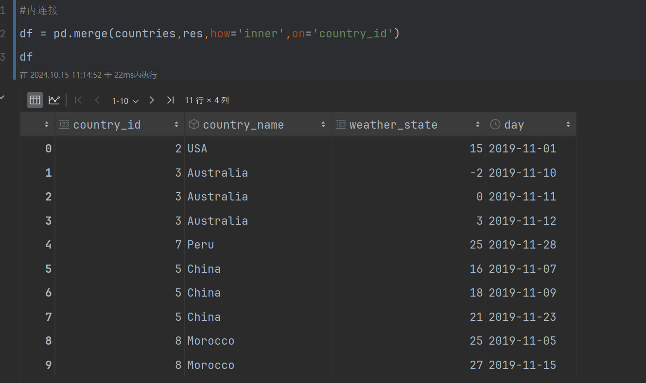 在pandas 第二步,内连接2个表,条件是国家id=国家id