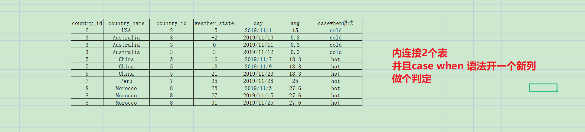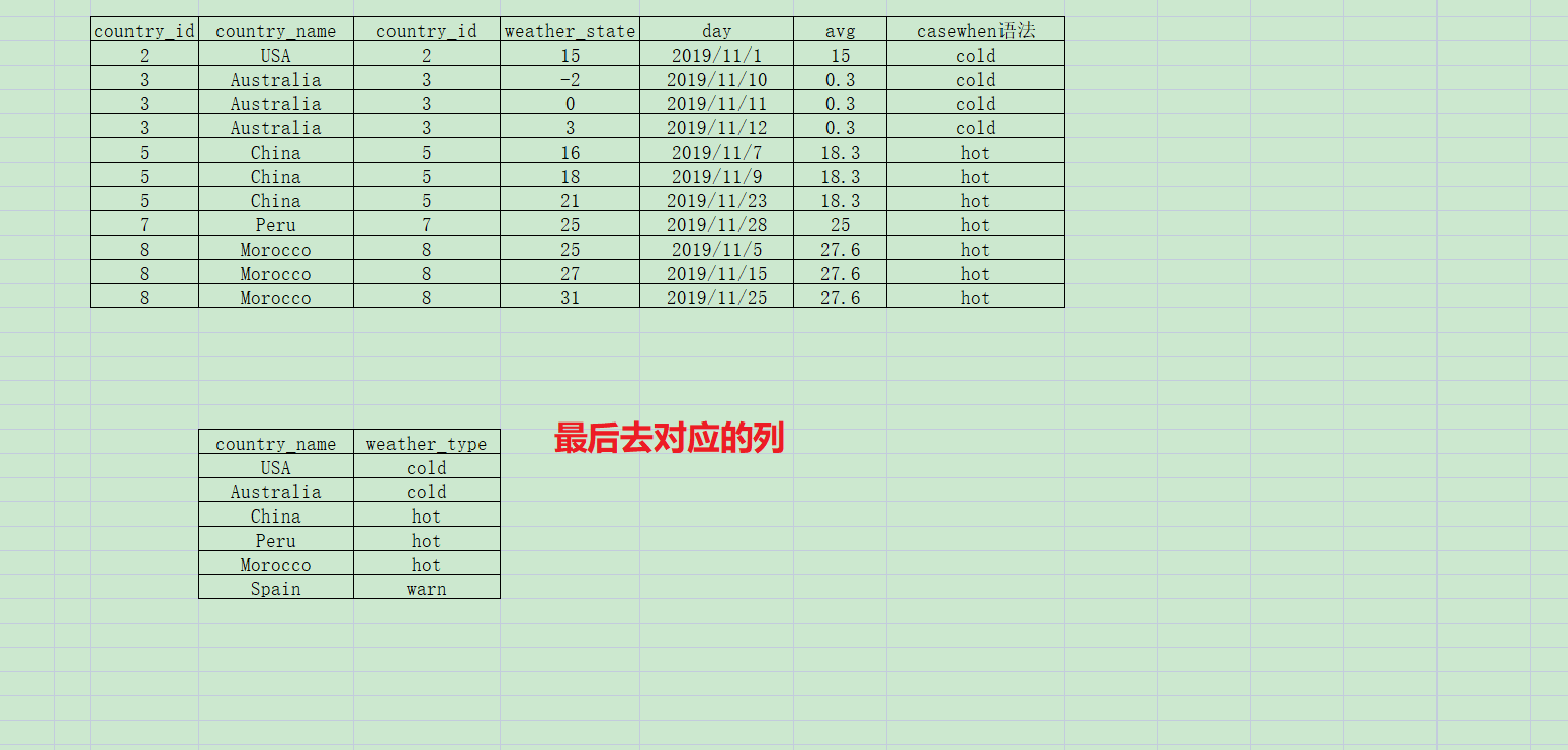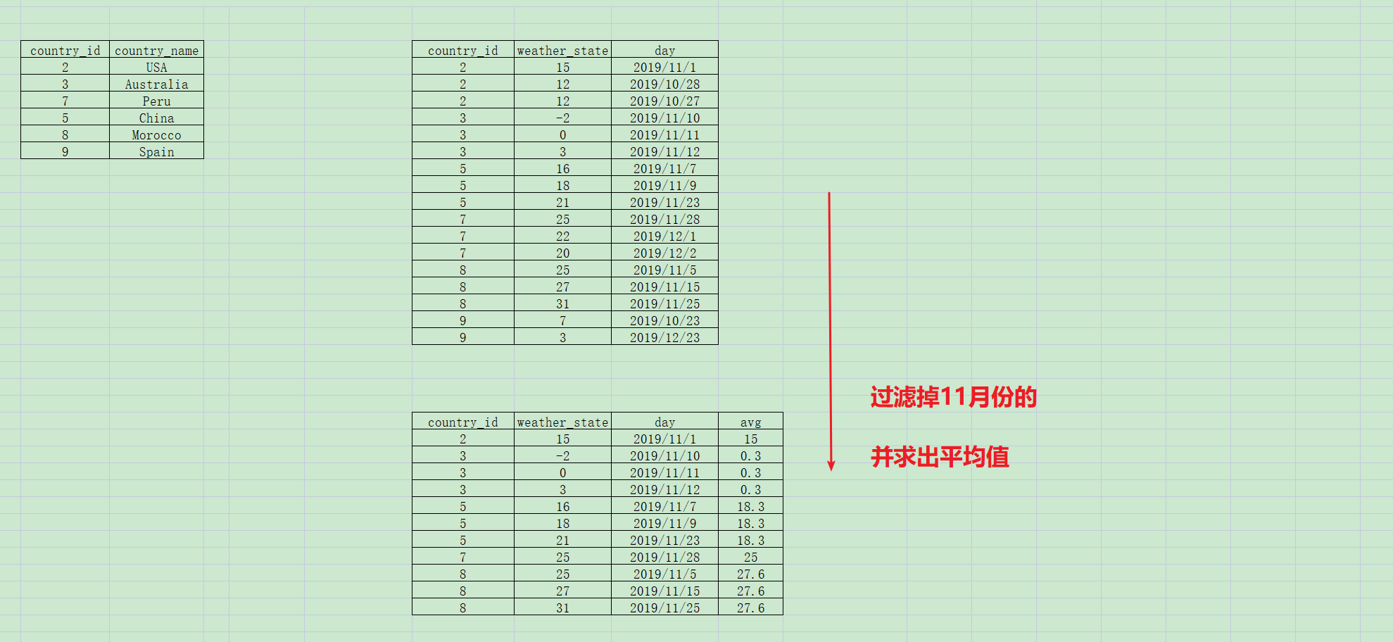 输入: Countries table: +------------+--------------+ | country_id | country_name | +------------+--------------+ | 2 | USA | | 3 | Australia | | 7 | Peru | | 5 | China | | 8 | Morocco | | 9 | Spain | +------------+--------------+ Weather table: +------------+---------------+------------+ | country_id | weather_state | day | +------------+---------------+------------+ | 2 | 15 | 2019-11-01 | | 2 | 12 | 2019-10-28 | | 2 | 12 | 2019-10-27 | | 3 | -2 | 2019-11-10 | | 3 | 0 | 2019-11-11 | | 3 | 3 | 2019-11-12 | | 5 | 16 | 2019-11-07 | | 5 | 18 | 2019-11-09 | | 5 | 21 | 2019-11-23 | | 7 | 25 | 2019-11-28 | | 7 | 22 | 2019-12-01 | | 7 | 20 | 2019-12-02 | | 8 | 25 | 2019-11-05 | | 8 | 27 | 2019-11-15 | | 8 | 31 | 2019-11-25 | | 9 | 7 | 2019-10-23 | | 9 | 3 | 2019-12-23 | +------------+---------------+------------+ 输出: +--------------+--------------+ | country_name | weather_type | +--------------+--------------+ | USA | Cold | | Austraila | Cold | | Peru | Hot | | China | Warm | | Morocco | Hot | +--------------+--------------+ 解释: USA 11 月的平均 weather_state 为 (15) / 1 = 15 所以天气类型为 Cold。 Australia 11 月的平均 weather_state 为 (-2 + 0 + 3) / 3 = 0.333 所以天气类型为 Cold。 Peru 11 月的平均 weather_state 为 (25) / 1 = 25 所以天气类型为 Hot。 China 11 月的平均 weather_state 为 (16 + 18 + 21) / 3 = 18.333 所以天气类型为 Warm。 Morocco 11 月的平均 weather_state 为 (25 + 27 + 31) / 3 = 27.667 所以天气类型为 Hot。 我们并不知道 Spain 在 11 月的 weather_state 情况所以无需将他包含在结果中。