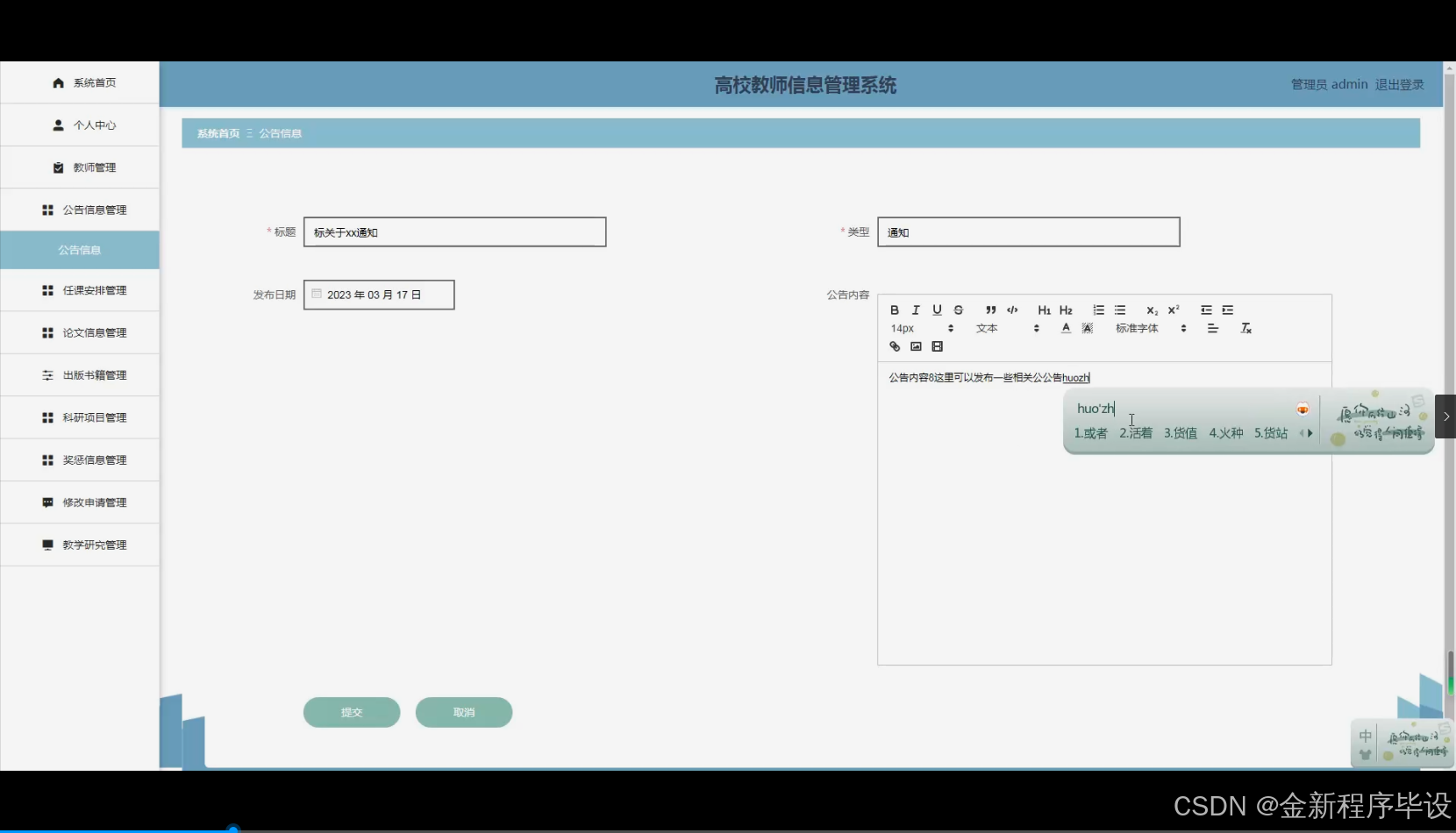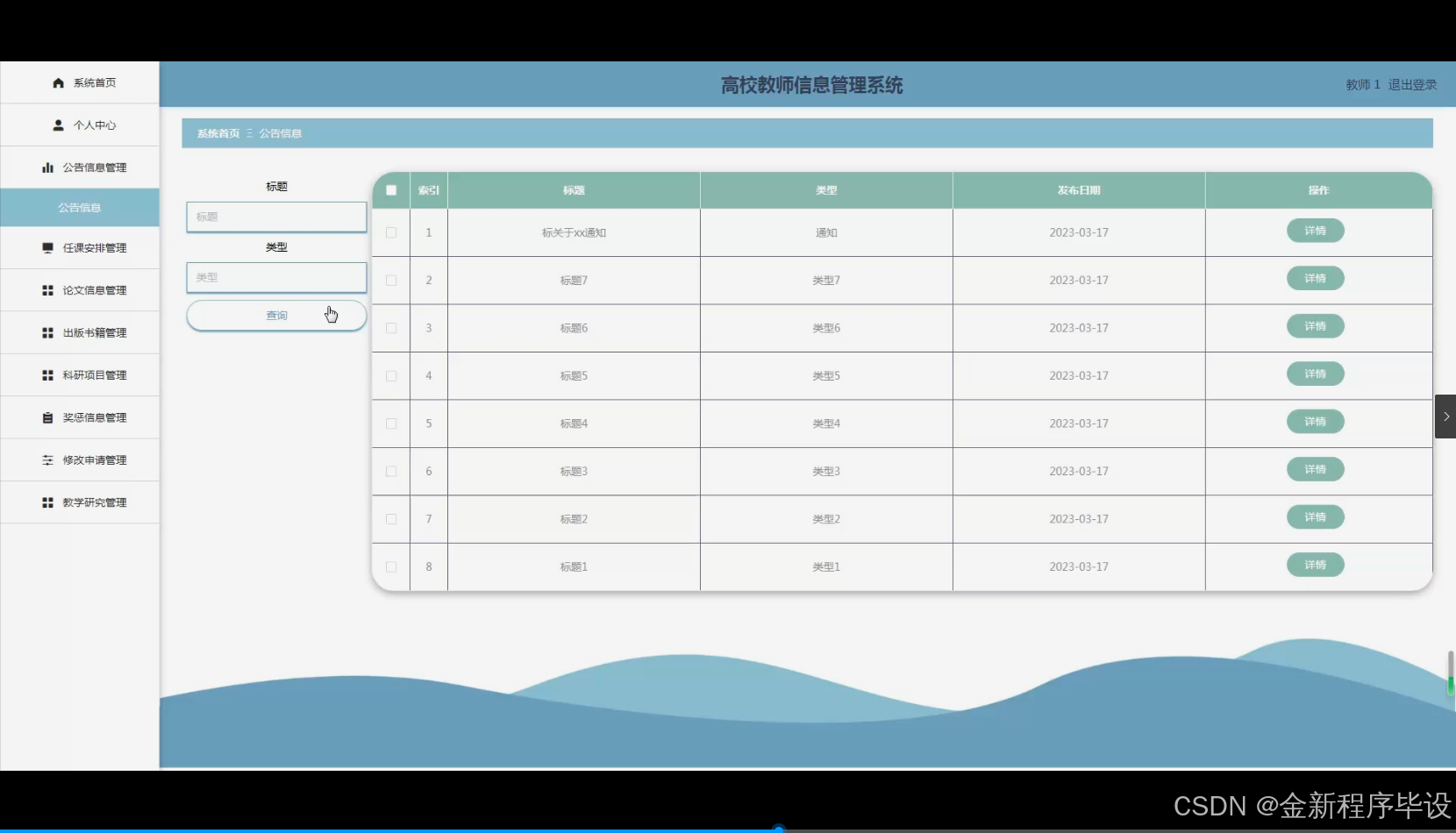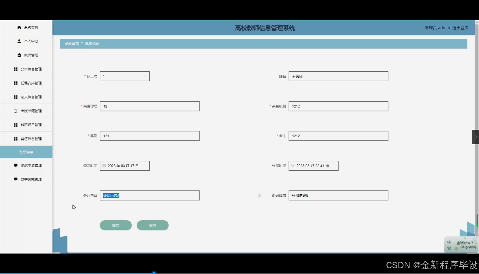 - 现实意义:在现实中,高校教师的信息管理涉及多个方面且日益复杂。构建这样一个全面的教师信息管理系统,能够提高高校对教师信息管理的效率,方便高校在教师任课安排、科研项目跟进、教学研究等多方面进行精准决策,同时也有助于教师及时了解自己的奖惩信息、公告信息等,从而提升整体的教学和科研质量。