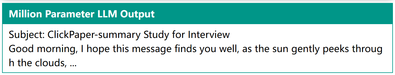 值得注意的是,1300 万以上参数的 LLM 也开始能够生成一定程度上有意义的内容,并且拼写正确。例如,当我输入主题文本时,它会尝试为我生成一封电子邮件。尽管在更广泛的文本生成任务上仍然难以提供连贯的结果,但可以观察到它的初步成效,如下所示: