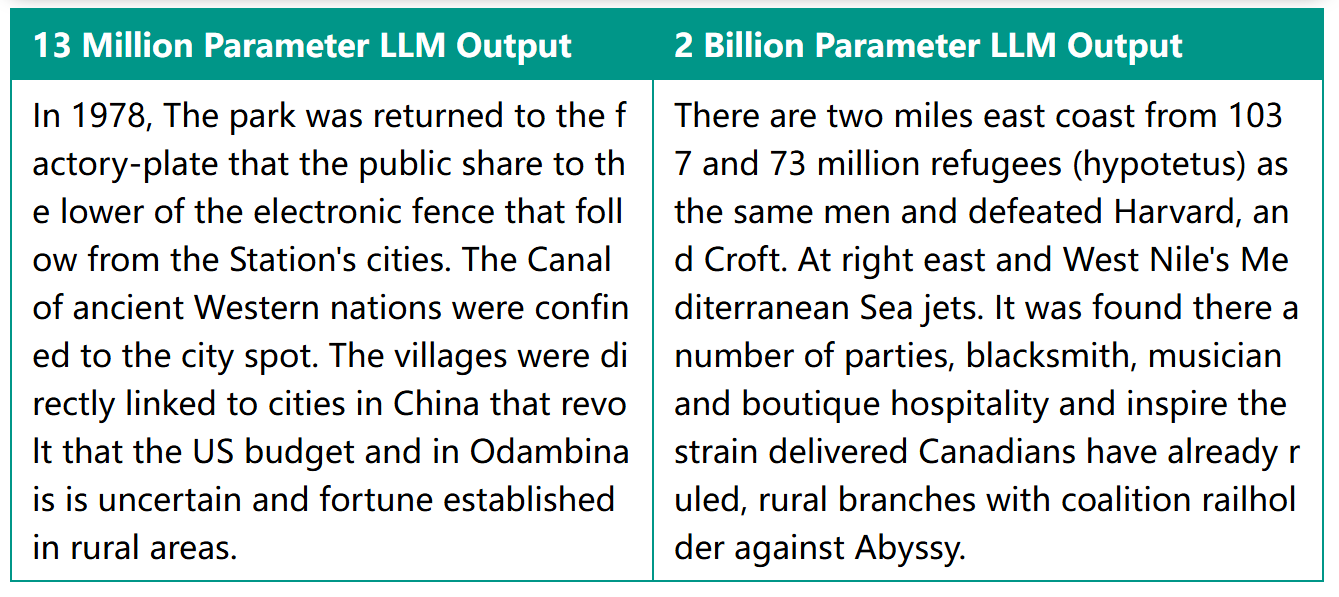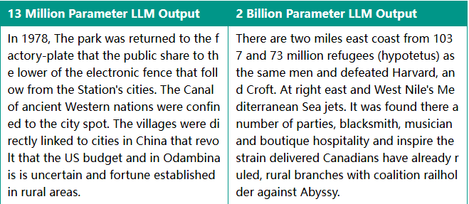 然而,随着上下文变长、变复杂,文本的连贯性开始下降。例如,在十亿参数模型的输出中,句子“There are two miles east coast from 1037 and 73 million refugees (hypotetus)”以及“blacksmith, musician and boutique hospitality and inspire the strain delivered Canadians”变得难以理解,句子结构不够流畅,信息表达也显得割裂。尽管其中的单词可能都是正确的,但整体意思变得混乱且缺乏逻辑性。