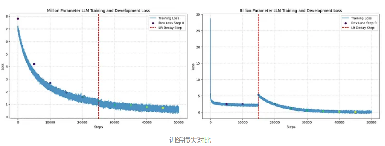 十亿参数模型在训练初期的损失较高,并且波动较大。尽管最初下降较快,但随后出现震荡,直到逐渐趋于平稳。这表明更大的模型在学习初期更难找到合适的优化方向,可能需要更多的数据以及更精细的超参数设置。当降低学习率(红色曲线)时,损失下降得更加稳定,这表明调整学习率有助于模型优化。