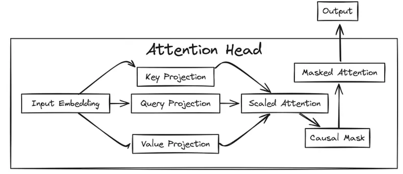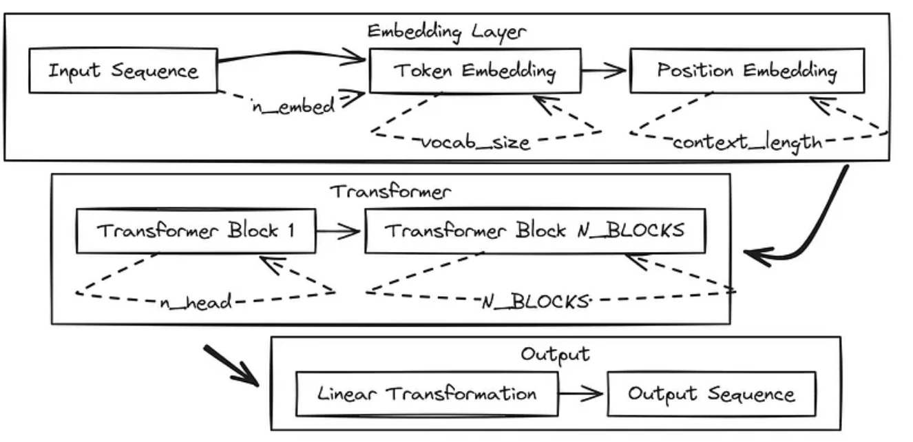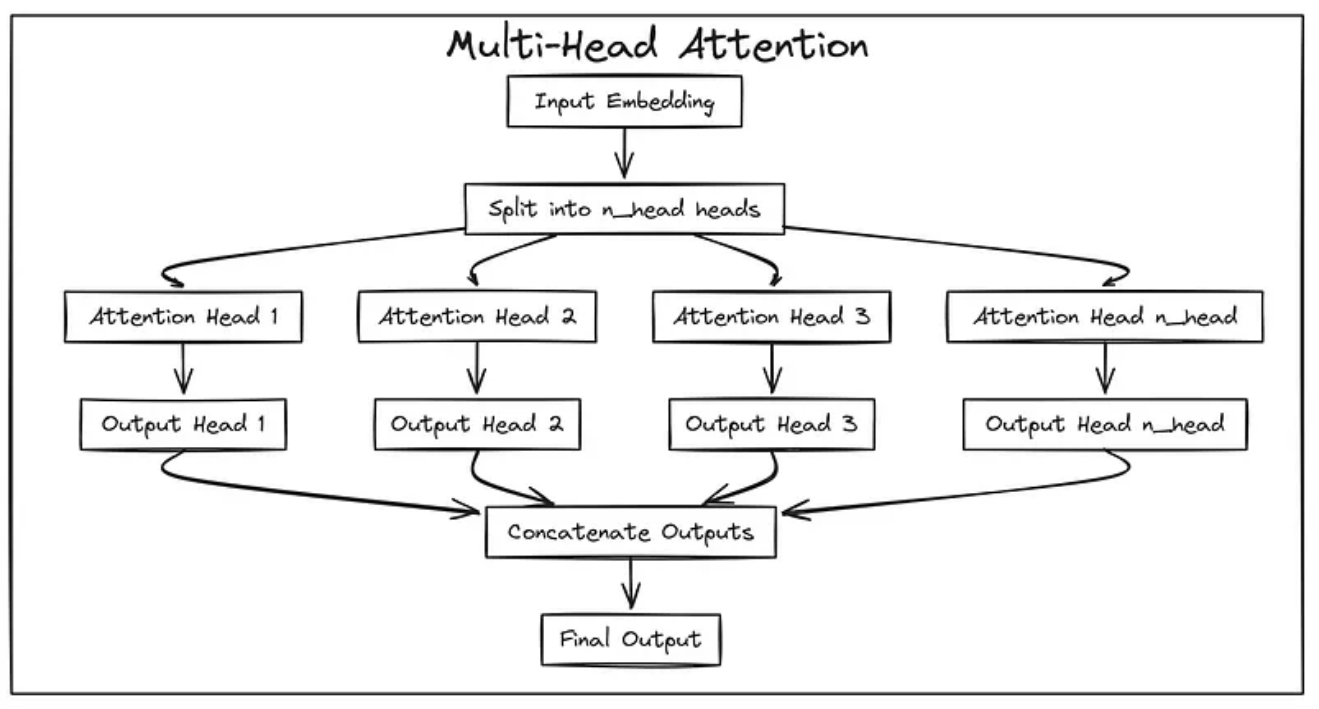 让我们快速了解一下 Transformer 架构如何处理和理解文本。它通过将文本分解成更小的单元,称为 token,然后预测序列中下一个 token。一个 Transformer 包含许多层,这些层被称为 Transformer 块,它们堆叠在一起,最终一层用于进行预测。自注意力头(Self-Attention Heads):它们确定输入中的哪些部分对模型来说最重要。例如,在处理一个句子时,注意力