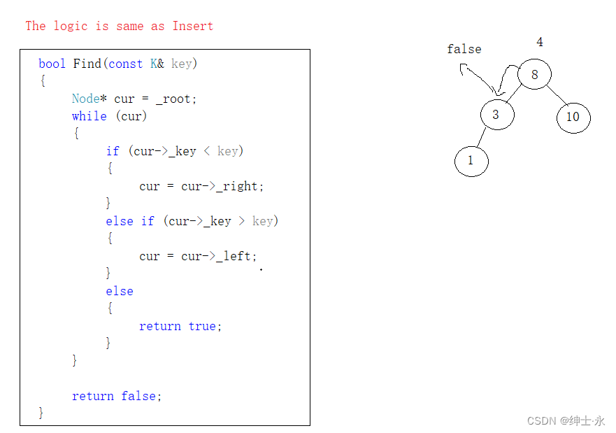直接通过搜索二叉树的性质就可以进行查找,当key值大于cur->_key的值时,就查找cur的右子树,key值小于cur->_key的值时,就查找cur的左子树,直到找到,或者找不到cur == nullptr结束,即逻辑和Inser中的逻辑大同小异;