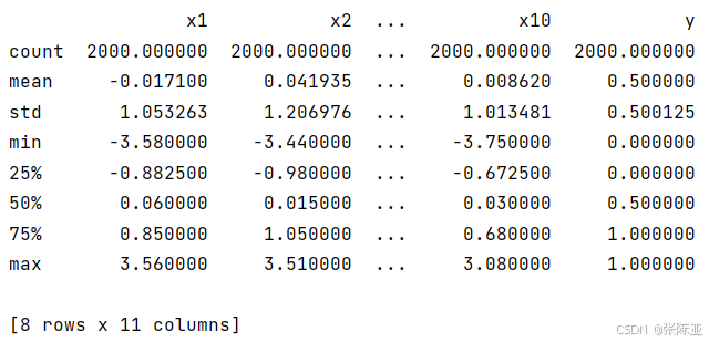 通过Pandas工具的describe()方法来来统计变量的平均值、标准差、最大值、最小值、分位数等信息: