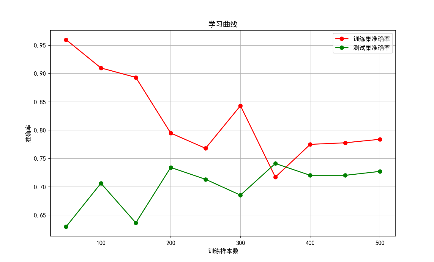 样本数: 500, 训练准确率: 0.7840, 测试准确率: 0.7273
