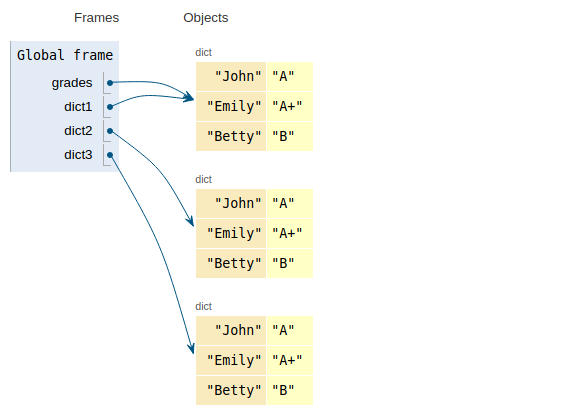 所有的dict1,dict2和dict3都包含与grades完全相同的键值对。但是,dict1只是指向grades中键/值对的指针。因此,grades的任何变化也将改变dict1。