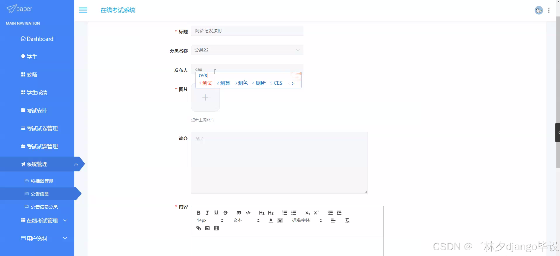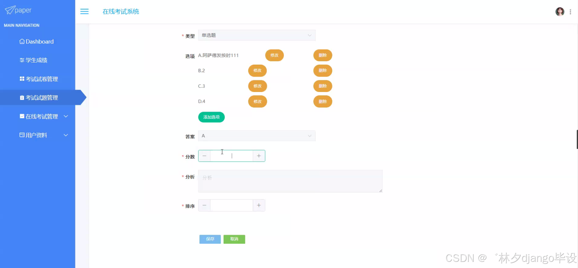 - 学生模块:设计学生的注册、登录功能,学生可以查看个人信息、考试安排等内容。同时,开发学生答题功能,包括不同题型(如选择题、填空题、简答题等)的答题界面设计,以及答案提交和保存功能。