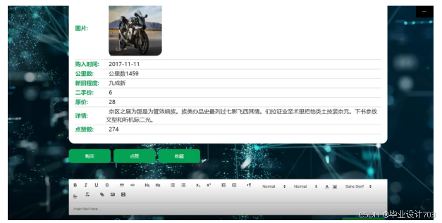 浏览摩托车:用户可以根据摩托车类型浏览摩托车的信息,并选中某个摩托车查看详情,例如:标题、摩托车型号、车辆品牌、摩托车类别、排量、车型、、图片、价格等。