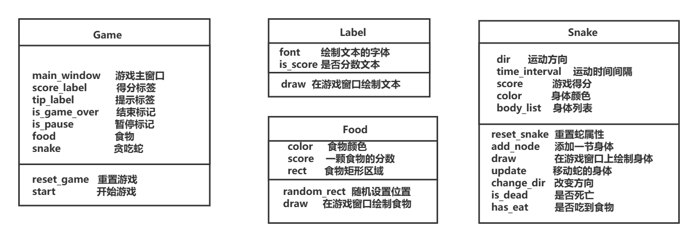 根据类的设计,在贪吃蛇游戏项目中设计2个模块,分别是:
