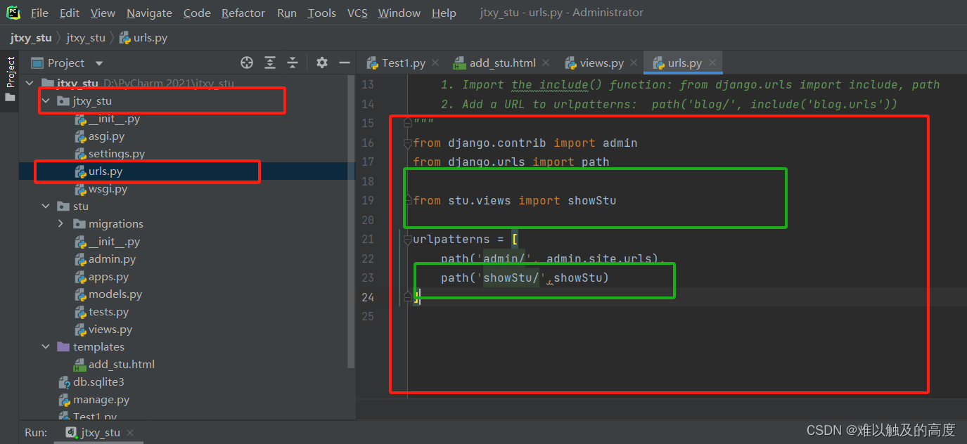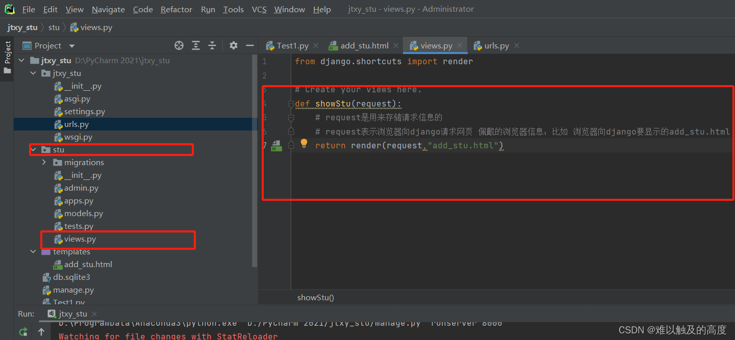 # request表示浏览器向django请求网页 佩戴的浏览器信息:比如 浏览器向django要显示的add_stu.html