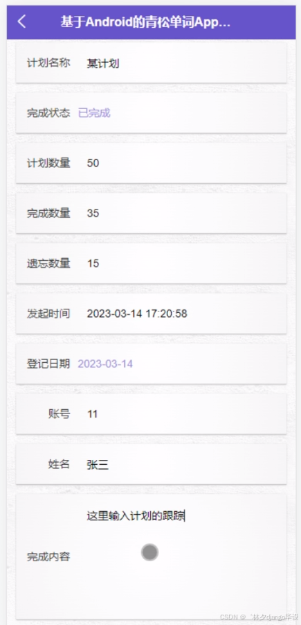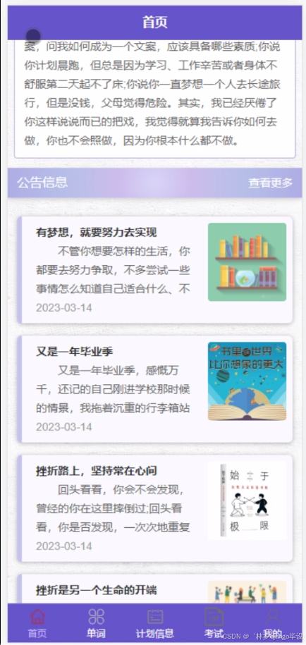 - 计划信息功能:用户可以根据自己的学习时间和目标制定学习计划,设置每天学习的单词数量、学习的时间段等信息。系统可以根据用户的计划生成学习任务列表,提醒用户按时学习。