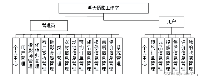 为了更好的去理清本系统整体思路,对该系统以结构图的形式表达出来,设计实现该明天摄影工作室的功能结构图如下所示: