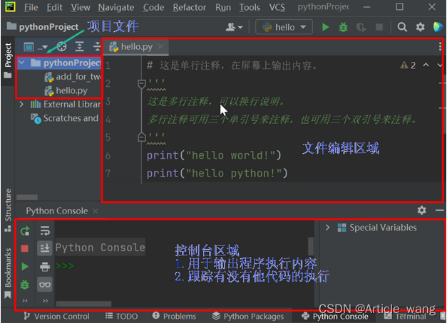 3.双击新建的hello.py文件,在pycharm编辑器打开,输入代码: