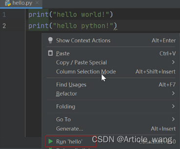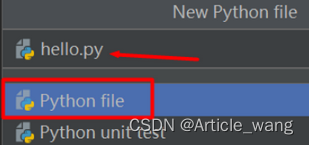 - 使用PyCharm刚才新创建项目,新建 hello.py文件。新建py文件的方法:右击项目名称 --》New --》Python File