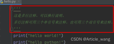 - 如果希望编写的注释信息很多,一行⽆法显示,就可以使用多行注释。用一对连续的三个引号(单引号和双 引号都可以),把注释内容包起来。