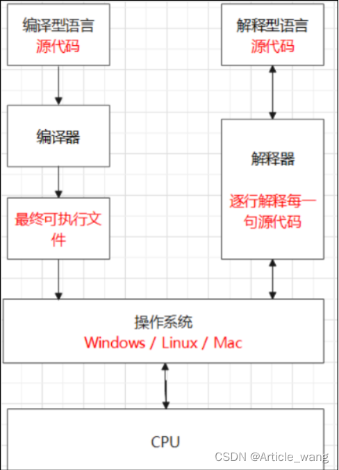- 解释型语言:编写的程序以文本方式先存储程序代码,最后将代码⼀句⼀句的直接运行。在发布程序时,看起来省了道编译工序,但是每次运行程序的时候,必须先解释成机器语言,然后再运行。