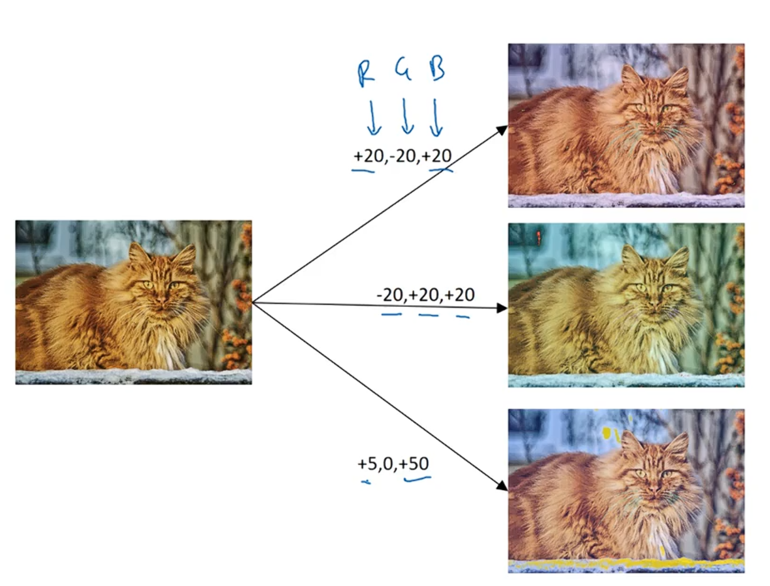 第二类常用的数据增强方式是色彩变化。你可以给一张图片在rgb 3通道上加入不同的扰动,来实现不同的色彩变化,让你的学习算法,在应对图像色彩变化时更具健壮性。