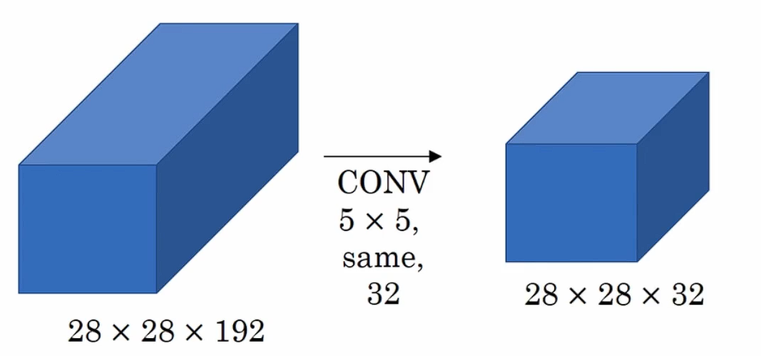 我们现在有一个28×28×192大小的输入,然后使用32个5×5的过滤器进行Same卷积,输出为28×28×32。