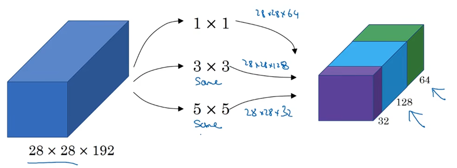 这是一个28×28×192的输入层,Exception网络层的作用是:与其在卷积神经网络中选择一个你想要使用的过滤器尺寸,或者选择一个卷积层或一个池化层,不如全都选择。