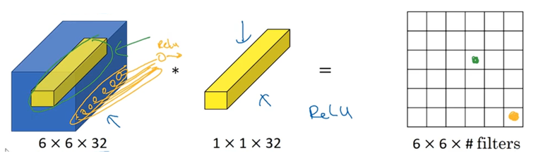 如果你有一张6×6×32的图片,那么使用1×1过滤器进行卷积效果更好。具体来说,1×1卷积所实现的功能是:逐一扫过这里的36个不同位置,然后进行对应元素间的乘法,将左边的32个数和过滤器中的32个数相乘,然后使用非线性函数Relu。