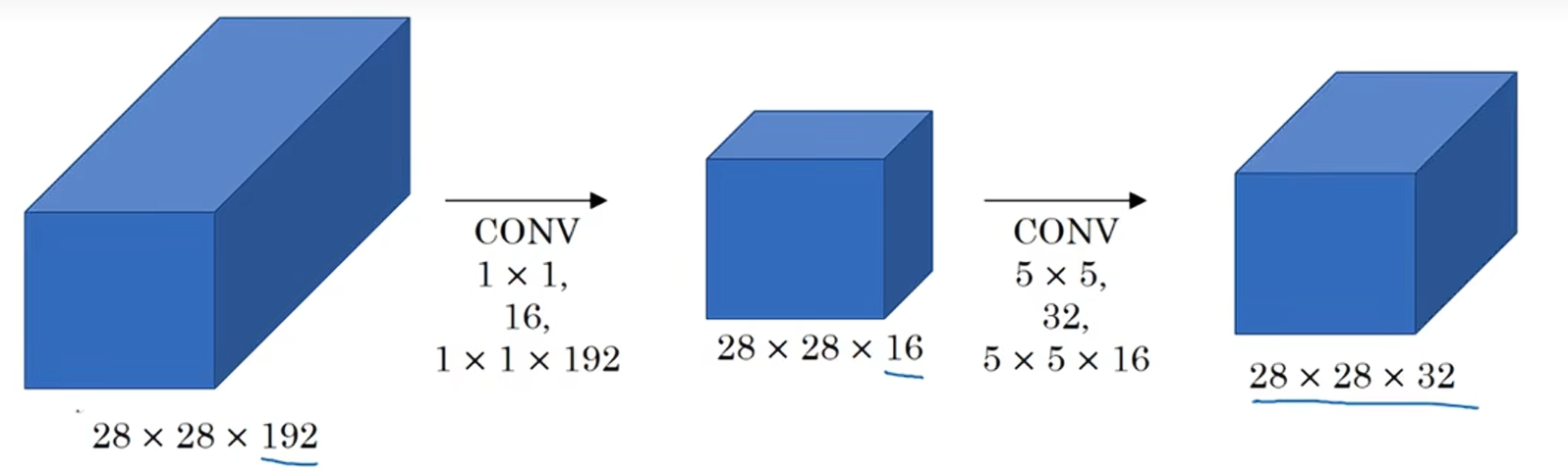 这两种方法中,输入都是28×28×192,输出28×28×32。但是在第二种方法中,我们先将这个较大的输入,减小成一个较小的中间值,也就是只有16个通道,而不是192个通道,有时把中间的这一层叫做瓶颈层。